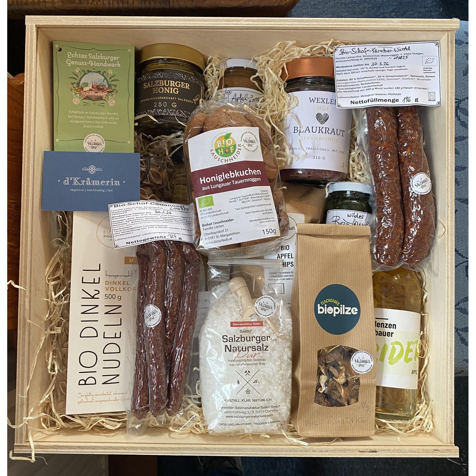 Inhalt: Marmelade,Pesto und Chutney aus Thalgau, Nudeln aus St. Georgen, Blaukraut oder eingelegtes Gemüse aus Filzmoos, Schaf Kärntner Würstl aus Thalgau, Honiglebkuchen aus dem Lungau, Cider, Apfelchips aus Hallwang, Salz aus Hallein, Honig...
